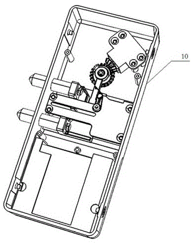在圖中:10.金屬底座;11.定位柱;12.電機(jī)座;13.導(dǎo)軌;14.通孔;20.電機(jī);21.電機(jī)壓板;30.電機(jī)齒輪;40.旋鈕齒輪;41.擋片;50.門內(nèi)旋鈕;51.主軸;60.撥桿;70.滑板;71.插銷;72.u型槽;80.滑板壓板;81.第二通孔;90.助力彈簧。